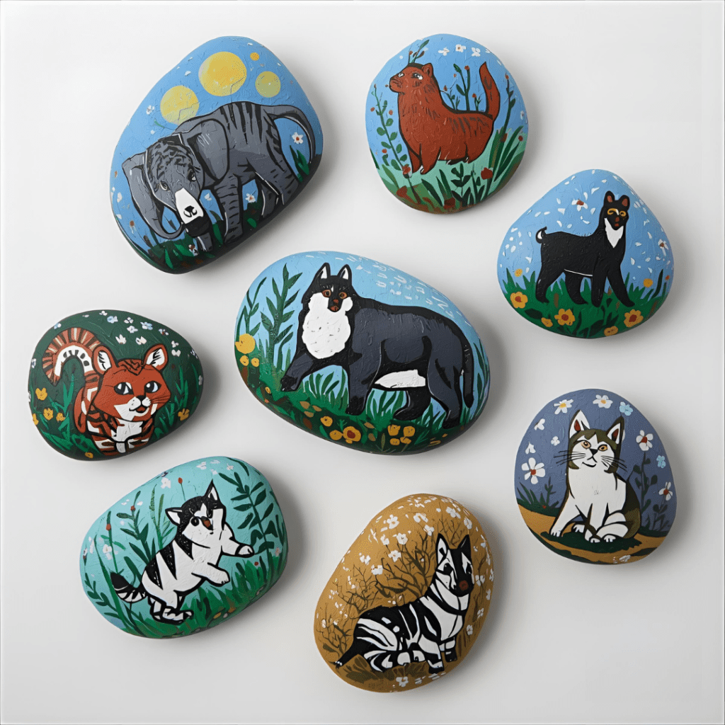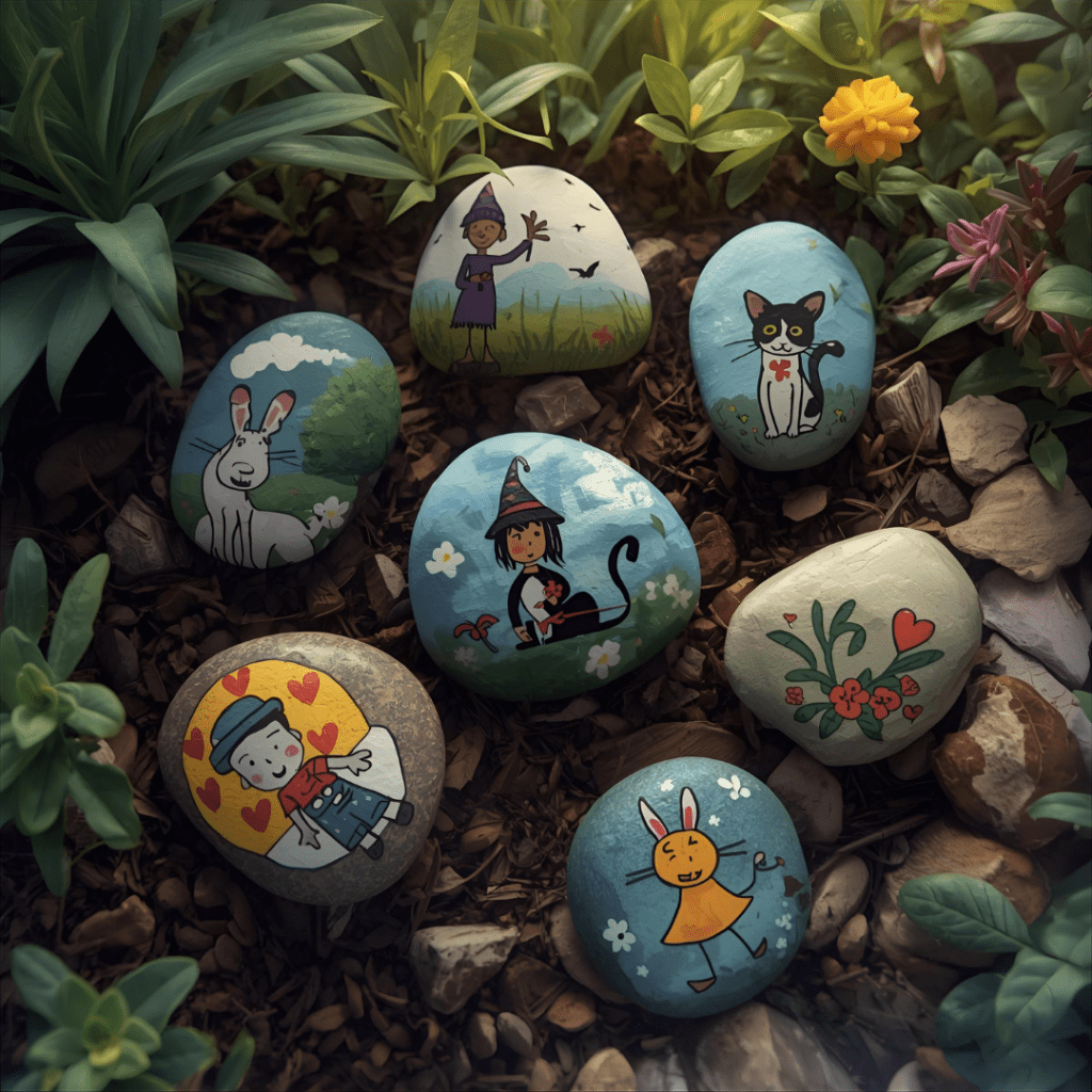Collect smooth pebbles and paint simple pictures on them – like suns, trees, or animals. Once dry, children can use them to tell stories, mixing and matching the stones to create endless adventures.